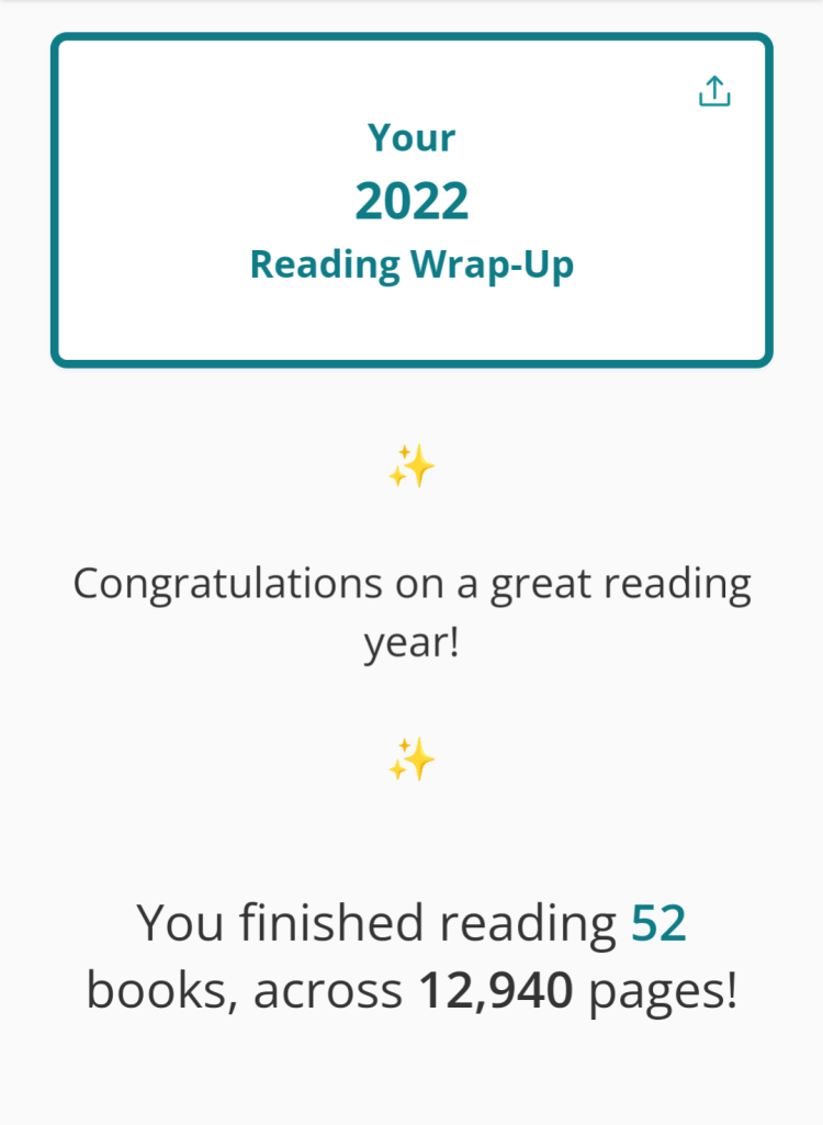 Anyways, during 2022, I read a total of 52 books, and 50 was my goal for the year, so woohoo!